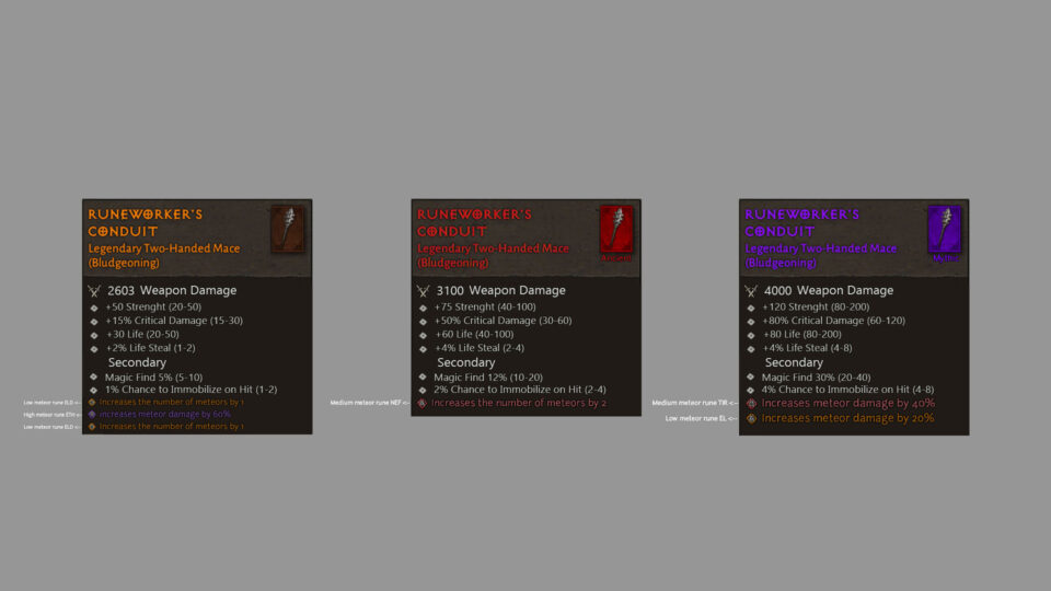Slot equipaggiamento runeword dedicato per item runeword con 3 slot: artfeatto, talismano, reliquia. Questi oggetti sono bianchi e solitamente non hanno attributi ma solo castoni, da 2 a 4, in rari casi possono avere un attributo che incrementa l’effetto delle rune dal 10 al 20%. In questi castoni si possono inserire solo rune leggendarie specifiche per runeword che possono essere inserite solo in questi oggetti e che danno un solo attributo fisso molto alto: d’attaco come (forza, velocità, crit, danno critico, danni) inseribili solo nel artefatto, di difesa come (all res, vita, % vita, armor) inseribili sono nel talismano e di tutte e due i tipi nella reliquia, ma potrò soltanto inserirne massimo due per tipo nella reliquia, per esempio massimo 2 di attacco e massimo 2 di difesa. Queste rune leggendarie sono estremamente rare ed ognuna di queste rune ha 3 colori, in base al colore saranno più o men efficaci e rare. Per esempio: una runa leggendaria Gul arancione che da 50 forza, runa gul rossa che da 100 forza e runa gul viola che da 150 forza, oppure runa leggendaria sur arancione che dà vita 2%, runa sur rossa 4% vita, runa sur viola 6%. In questo modo mi andrò a creare una oggetto come se fosse una runeword o un unico con stat fisse che decido io. Per esempio un artefatto con 4 socket con 2 gul viola quindi 300 forza, una ohm viola che da 75% di danno critico e una Lo viola che da 6% di crit.